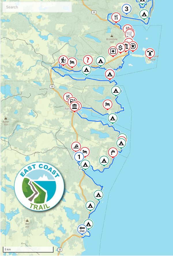Dudley created his own digital map with the GaiaGPS app, including; campsites, post offices, restaurants, water sources, store and food. Download the East Coast Trail GPX file and then upload to your smartphone onto the GaiaGPS app. We always knew where we were and where to go.
